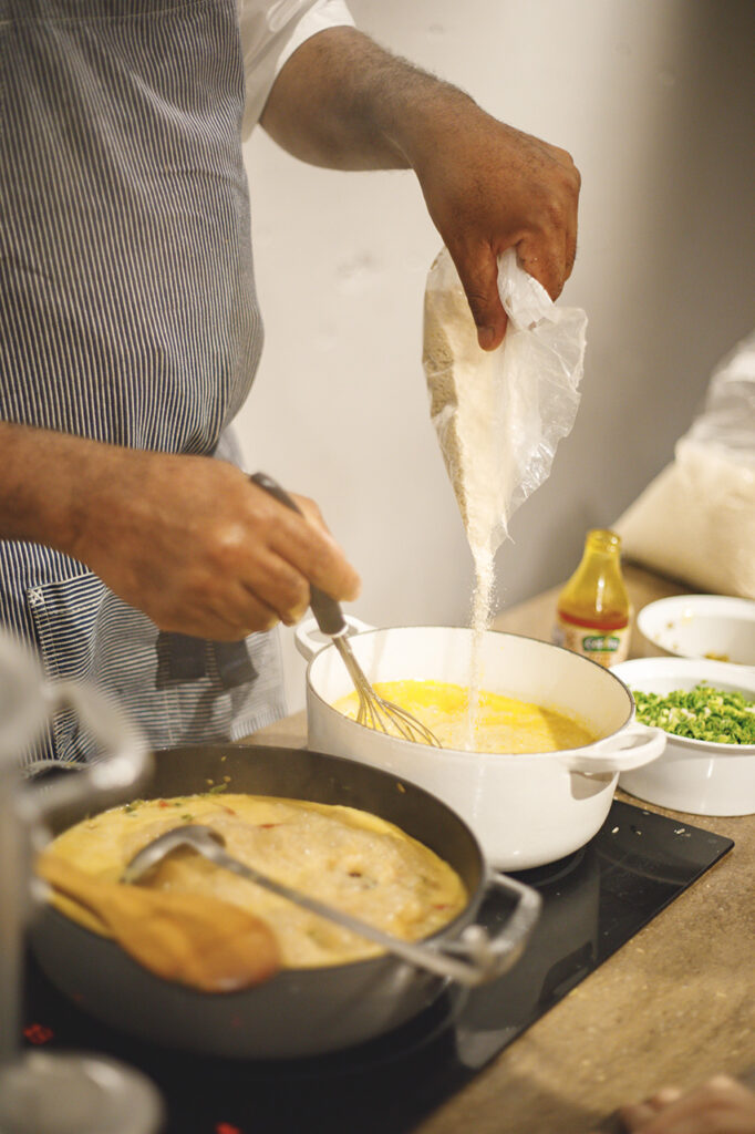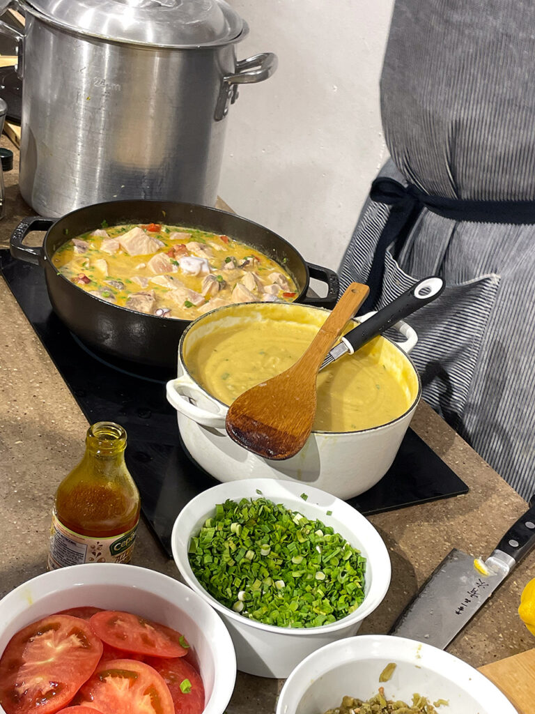 After the shopping is complete, we move to the kitchen. Thiago sets to the task of cutting the vegetables with a steady rhythm. The menu contains dishes from Brazil’s northeast: moqueca de peixe, cashew nut soup, and caipirinha. Moqueca is a type of seafood stew that uses coconut milk. The name comes from an African word which refers to a slow-cooked stew and is cooked in a clay pot called a mouquequeira. The ingredients for tonight’s stew are marlin and octopus—oily seafood which can withstand being cooked for many hours. Brazil is rich in different cultures—the proximity of the Amazon means that the north has indigenous culture, the southern part has European culture, and the northeastern region, particularly Bahia, has African culture. People say that the meeting of these peoples of different cultures is represented in Pernambuco’s cuisine.