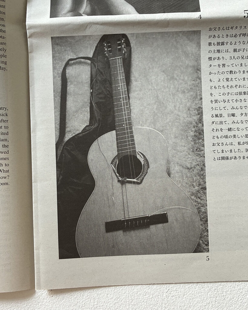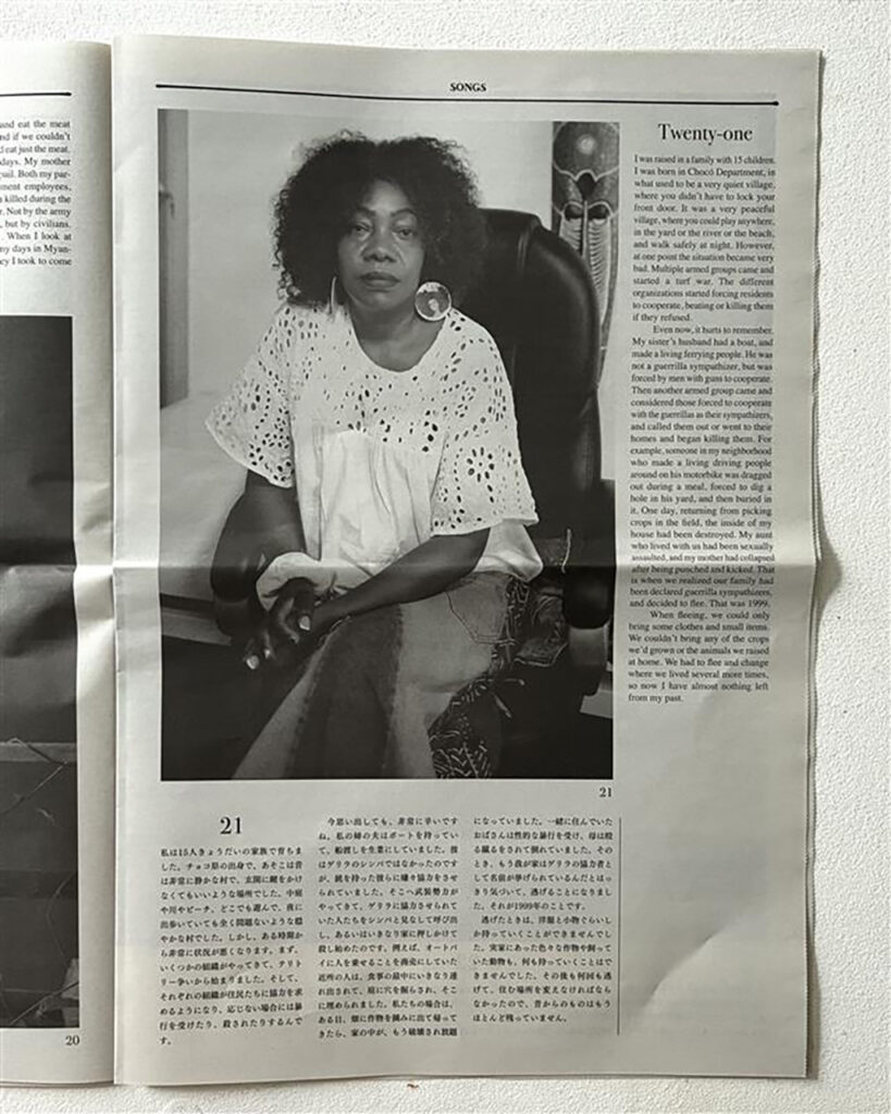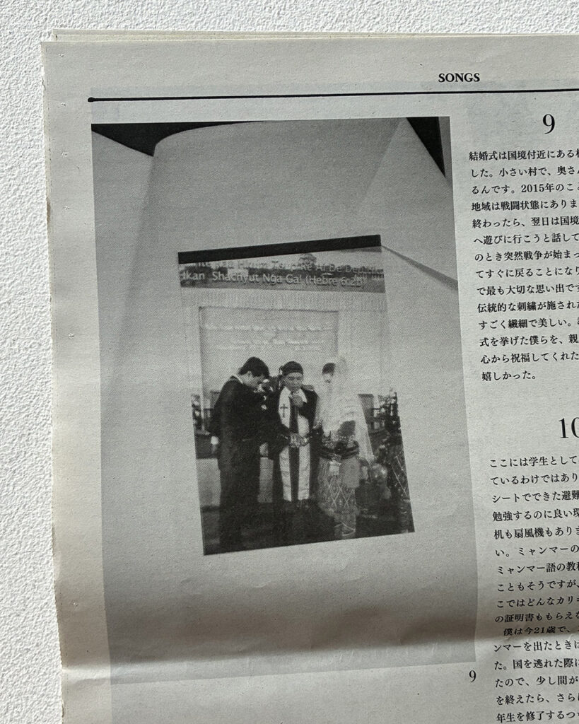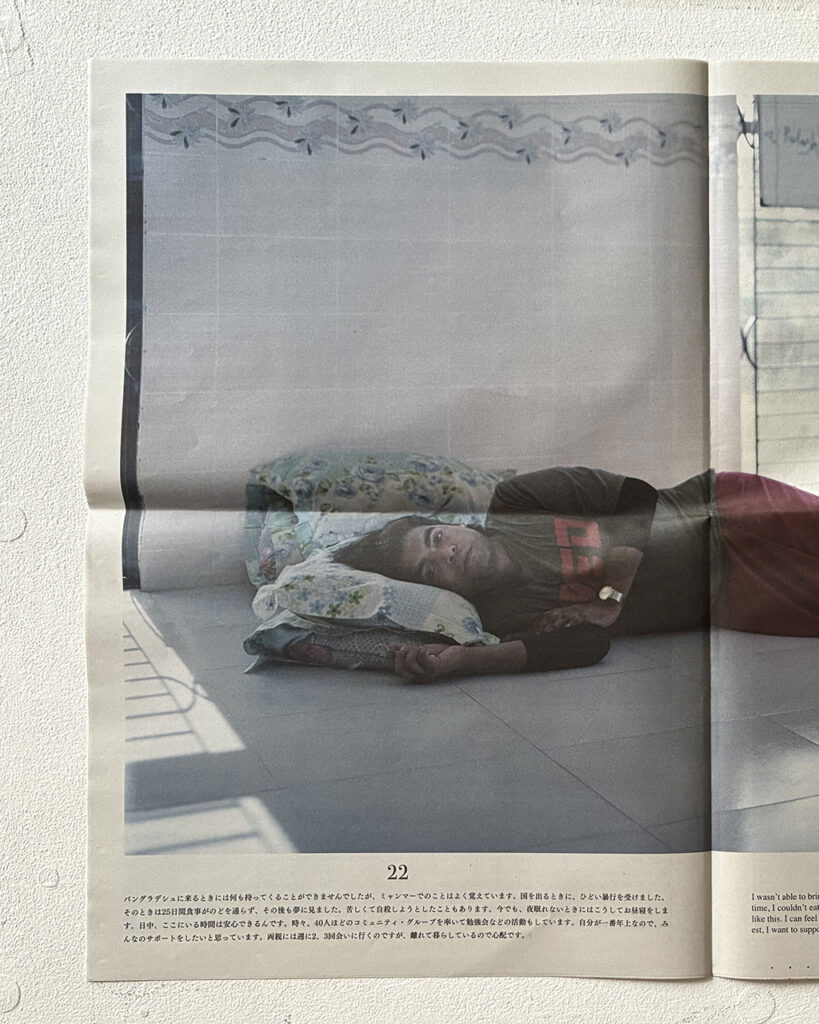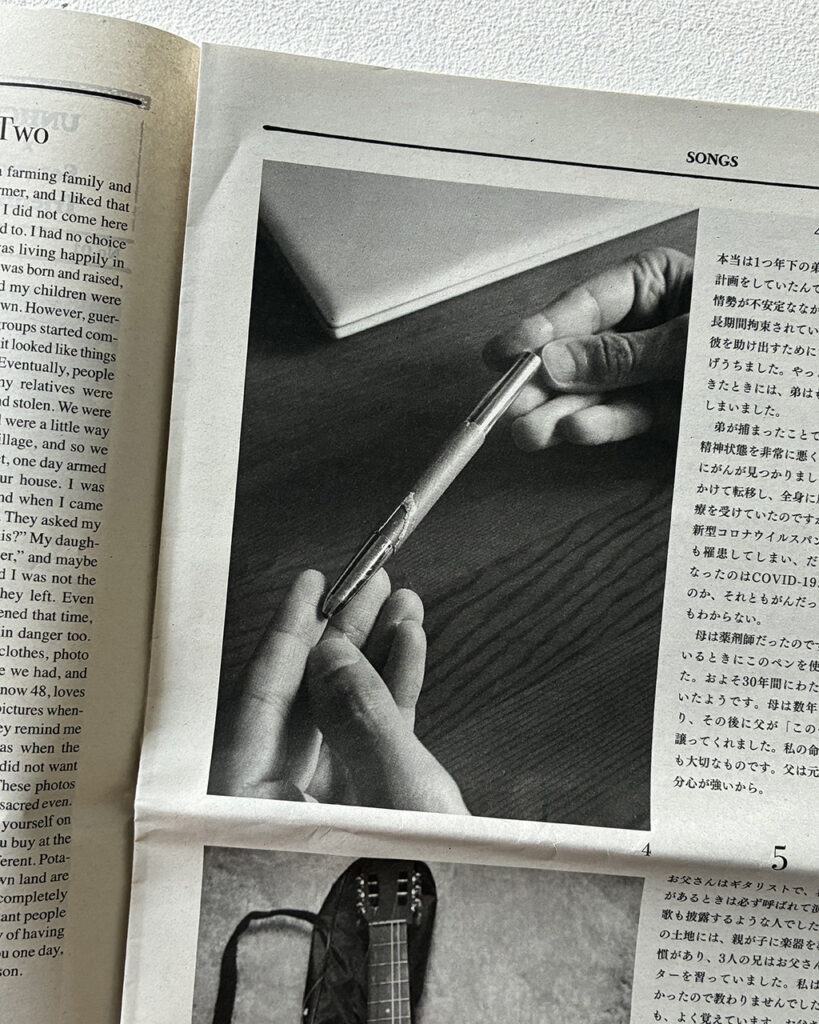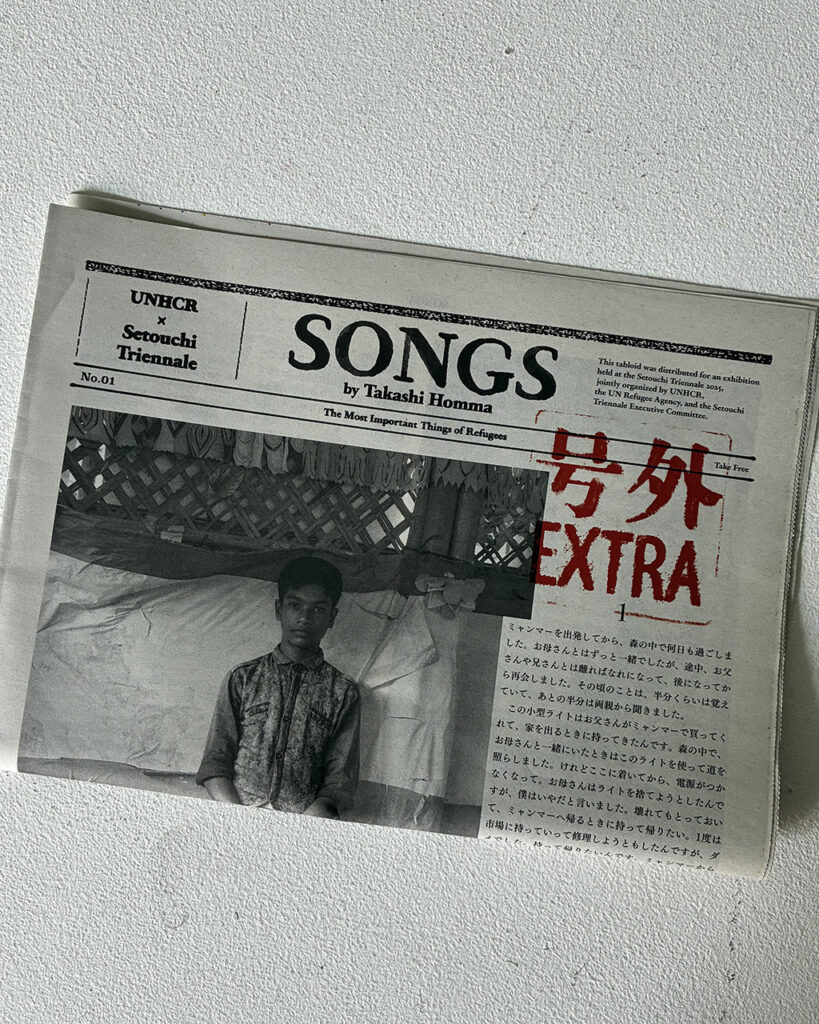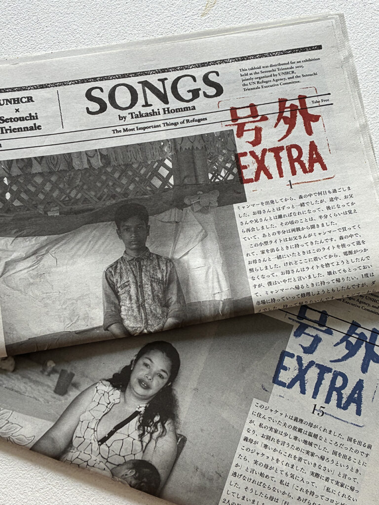 Commissioned by the United Nations High Commissioner for Refugees (UNHCR), Homma went to the world’s largest refugee camp in Cox’s Bazar, Bangladesh, refugee residences in the suburbs of Colombia, and to visit Syrian, Ukrainian, and Myanmar people who live in Japan, where he listened to their stories and took photographs. These people had various possessions that were their most important thing: a pen to remember someone by, a guitar, a family photo, a license, a wallet. At the same time, there were many people who fled with only the clothes on their back and didn’t have any possessions at all anymore. The monologues at the beginning of the tabloid that detail these people’s thoughts toward these items are only a small part of their refugee journeys—painful experiences that are difficult for those who were born and raised in Japan to imagine. The figure at the end of the tabloid which explains that the number of forcibly displaced people (based on the Convention Relating to the Status of Refugees) is 122.6 million people is extraordinary enough, but it is made ever more striking when you consider that this figure reported by the UNHCR represents people’s actual lives. The newspapers in Japan do not dedicate any space like this to refugees. Refugees are only spoken of in brief in the limited space of the media and may appear as nothing more than a complex issue, but it goes without saying that they all have their own individual lives. Art is good at focusing in on that and lending an ear to it.